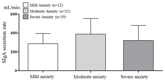 The SIgA concentrations and secretion rates according to BAI anxiety are presented in Figure 3 and Figure 4. The saliva flow rate was 3.02 ± 0.29 mL/min. One-way ANOVA revealed no significant SIgA concentration among the groups (p = 0.050). The SIgA secretion rate was also not significant among the groups (p = 0.685).