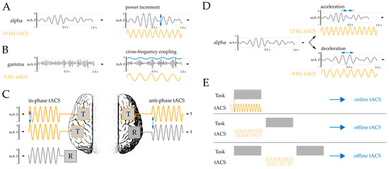Overview of different ways to modulate brain oscillations (A–D). (E) Online tACS: applied during a cognitive task; offline tACS: applied either prior to a cognitive task or between tasks. Note: T, target electrode; R, return electrode; mA, milliamps; t, time.