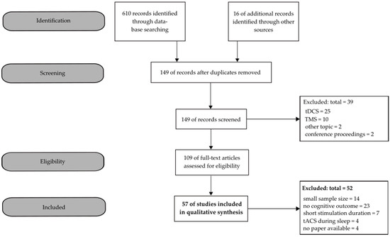 To be eligible for inclusion, studies needed to: (1) apply frequency-specific tACS, (2) focus on (at least) one of the above mentioned cognitive domains, (3) include healthy adults (>18 years or older) with a minimum of n = 15 for a within-subject or n = 20 for a between-subject design, and (4) stimulate continuously for at least 5 min.