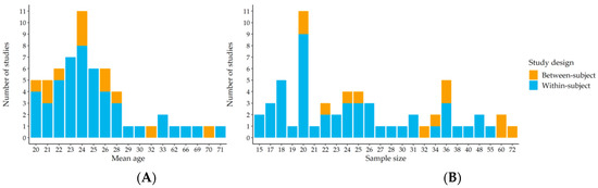 A comprehensive overview of all study designs, stimulation parameters, outcomes as well as risk of bias for all included studies can be found in Table 1. The risk of bias was rated as low when the following criteria were met: the sample size was sufficiently high, a control condition was defined, and a detailed description of statistical analysis was given. Otherwise, the risk of bias was rated as high. Figure 3 shows the mean age of the participants (A left) as well as the sample sizes (B right) of all included studies.