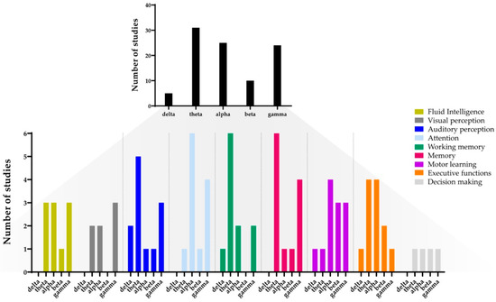 Some cognitive processes have been, more or less specifically, related to certain frequency bands [9]. Delta (0–4 Hz) has traditionally been associated with deep sleep and memory consolidation [10] and, only during recent years, it has been associated with attention [11] or with cognitive processes that rely on rhythmicity, e.g., certain motor functions [10]. Theta (4–7 Hz) oscillations have been mainly associated with working memory [12,13] and episodic memory [14]. Alpha (8–13 Hz) has been linked to executive functions [15], visual attention [16], and to memory processes [17]. Beta (13–30 Hz) has been related to motor functions and attention [18] as well as to working memory and executive control [19]. Gamma (30–80 Hz) has been linked to the processing of incoming information [20] as well as to working memory [21] and episodic memory [22]. Additionally, it plays a role in auditory perception [23].