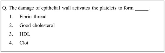 Figure 2. Each MCQ has four possible answers, with one correct answer. The time to answer each MCQ was 30 s within a maximum time limit of 10 min. Subjects were asked to press a numeric key on the keyboard, serially numbered # 1 to # 4, corresponding to each possible answer. The maximum allowed time for this is 10 min. The first retrieval was conducted 30 min after learning session, and the second retrieval session was conducted after 2 months of the first retrieval session.