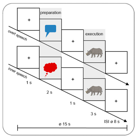 The picture naming task was programmed with Presentation Software (Neurobehavioral Systems, Inc., Berkeley, CA, USA, Version 18.1). Each participant sat in front of a 24′ computer monitor at a distance of 100 cm. The pictures were presented on a light grey screen. Each trial (Ø 15000 ms) started with a fixation cross (1000 ms), followed by a red speech or blue thinking bubble (2000 ms) initiating the Preparation Phase. These visual cues indicated whether the participants had to name the subsequently presented picture during the Execution Phase aloud (overt speech) or silently (inner speech). Between the preparation and execution phase the fixation cross was presented for 1000 ms. The execution phase lasted 3000 ms (Figure 1). After each picture a variable inter-stimulus-interval (ISI) with a mean duration of 8000 ms (6000–10,000 ms) showing a fixation cross followed. Because hemodynamic responses are sluggish, the variable ISI prevented a systematic overlap of the hemodynamic response of the fNIRS [55]. The selection of the duration of the preparation and execution phase was matched with the study of Kell et al. [42] and Gehrig et al. [41] where the preparation phase lasted 2000–4000 ms and the execution phase 2000–3000 ms.
