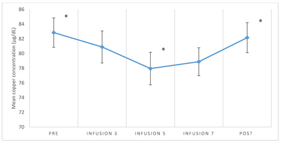 Mean values and standard errors of the mean values for the concentration of serum copper ions in individual measurements; * the concentration of serum copper in the pre-treatment measurement was significantly higher than that after the fifth infusion (p = 0.016), and the concentration after the treatment was significantly higher than that after the fifth infusion (p = 0.048).