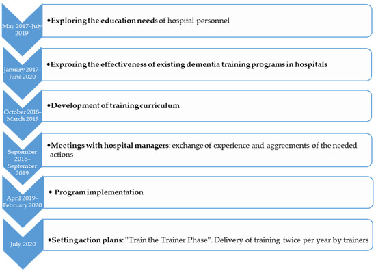 - Before developing the training curriculum, a study to explore the needs of hospital personnel on an upcoming dementia training was conducted (May 2017–July 2019). In order to develop a successful training program which may effectively transfer the theoretical concepts to practice, an educational needs analysis was necessary. Its aim was to explore the current status, interests and expectations of nursing staff, head nurses and physicians regarding a dementia training program [50]. According to bibliography, by exploring the educational needs of the target group and making the staff part of the training process, their motivation to learn and the implementation of what they learned is being increased [51].