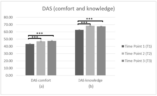 To search whether there were significant differences in staff attitudes (DAS comfort and knowledge) at T1, T2 and T3, a repeated measures ANOVA was conducted (n = 103). In regards to DAS (comfort) the data was met with the assumption of sphericity (χ2(2) = 2.887, p > 0.05). There was a significant main effect of time on the DAS (comfort) score F(2,204) = 21.37, p < 0.001, η2 = 0.173. Bonferroni was used to investigate whether differences between the means occurred between T1 and T2, T2 and T3, or T1 and T3. The comparisons indicated that there was a significant difference between the average score at T1 (M = 43.18, SD = 8.455) and T2 (M = 47.01, SD = 7.032), p < 0.001. There was also a significant difference between T1 and T3 (M = 47.44, SD = 7.692), p < 0.001, but not between T2 and T3 (p = 1.000), suggesting improvements in attitude (factor: comfort) over time. Regarding the DAS (knowledge) the data violated assumptions of Mauchly’s test of sphericity (χ2(2) = 8.553, p < 0.05) meaning that there is an increased probability of a Type II error. Since the estimate of sphericity was <0.75 the adjusted Greenhouse–Geisser F ratio [60] was used to make the F-value more conservative. There was a significant main effect of time on the DAS (knowledge) score F(2,204) = 70.264, p < 0.001, η2 = 0.408. Bonferroni test was conducted to investigate the differences between T1 and T2, T2 and T3, or T1 and T3. The comparisons indicated a significant difference between T1 (M = 62.66, SD = 5.333) and T2 (M = 68.39, SD = 4.262), p < 0.001. There was also a difference between T1 and T3 (M = 67.44, SD = 5.143), p < 0.001, but the difference between T2 and T3 was not significant (p = 0.212), suggesting that improvements in attitude (factor: knowledge) sustain over time (Figure 3, Table 2).