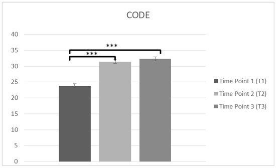 Another repeated measures ANOVA was conducted in staff confidence of caring PwD (CODE) at T1, T2 and T3. The data (n = 102) was met the assumption of shpericity (χ2(2) = 0.203, p > 0.05) and a significant main effect on time was observed in CODE score F(2,200) = 114.38, p < 0.001, η2 = 0.534. Bonferroni test was applied and T1 (M = 23.77, SD = 6.839) was lower than T2 (M = 31.43, SD = 6.083), p < 0.001. There was also significant difference between T1 and T3 (M = 32.31, SD = 5.767), p < 0.001 and there was not any difference between T2 and T3 (p = 0.457), suggesting improvements in confidence over time (Figure 4, Table 2).