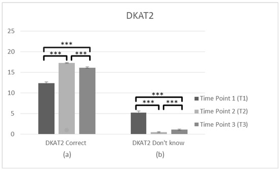 To search main differences in three time points, two further ANOVAS about the correct and don’t know answers were conducted. Specifically, the analysis of DKAT2 (correct answers) scores (n = 102) showed a violation of assumptions of Mauchly’s test of sphericity (χ2(2) = 36.991, p < 0.05) and the adjusted Greenhouse–Geisse F ratio was used. There was a significant main effect of time on the DKAT2 (correct answers) score F(2,202) = 179.83, p < 0.001, η2 = 0.640. The comparisons between three time points revealed a significant difference between the average score, which was lower at T1 (M = 12.33, SD = 3.173) than T2 (M = 17.24, SD = 1.517), p < 0.001. There was also a significant difference between T1 and T3 (M = 16.13, SD = 1.938), p < 0.001 and between T2 and T3 (p < 0.001), suggesting improvements in general knowledge about dementia over time, with a slight decrease in the follow up measurement. DKAT2 (don’t know answers) (n = 102) also violated assumptions of Mauchly’s test of sphericity (χ2(2) = 122,774, p < 0.05) and the adjusted Greenhouse–Geisse F ratio was used, F(2,202) = 133.48, p < 0.001, η2 = 0.569 revealing a significant main effect of time. T1 (M = 5.21, SD = 4.215) was higher than T2 (M = 0.50, SD = 1.022), p < 0.001. There was also significant difference between T1 and T3 (M = 1.09, SD = 1.561), p < 0.001 and between T2 and T3 (p < 0.001), suggesting a decrease of don’t know answers in the staff’s general knowledge over time, with a slight increase after 3 months. Generally, these findings suggest a significant improvement in gaining knowledge over time; however, some of the knowledge got lost (Figure 6, Table 2).