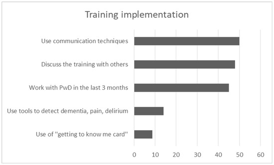 Regarding the individual performance, the use of communication techniques through PCC approaches, the use of tools to detect dementia, pain and delirium, or gathering patient information through documentation tools were all reported as changes in clinical practice three months later, being consistent with other study findings [28,30,31,32,35,36,39,40,41,42]. Specifically, calmness and kindness, friendly body position/touch, repetitions and orientation in a hospital environment were the most frequent communication techniques. Using photos, triggering pleasant memories or starting a conversation about a favorite routine, giving time to answer, getting information from family asking also them to stay with the patient, using techniques of grooming and eating based on patient’s strengths and eliminating their losses, were the most frequent PCC approaches. According to a recent study, the individualized care practices or use of PCC is frequently used when staffs knowledge and attitude are improved, a finding that is in line with this current study [68]. However, without institutional-level changes (care cultures that prioritized tasks, routines and physical health), hospital staff are often unable to provide PCC even when they have the experience and knowledge to do so [69].