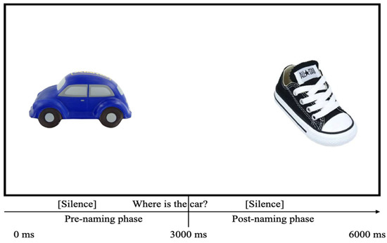 Visual stimuli for test trials consisted of 6 colorful pictures of familiar target objects that were presented in pairs placed side-by-side (target and distracter). The pictures were presented on a white background and selected to be comparable in size and visual salience. The images appeared in blocked pairs: ball–cup, hat–book, and shoe–car. The audio and visual stimuli were combined into video clips containing 24 test trials using iMovie software version 10.0.9 (Apple Inc.). Each clip’s duration was 6 s, and it was sub-divided into two 3-s phases: pre-naming and post-naming (Figure 1).