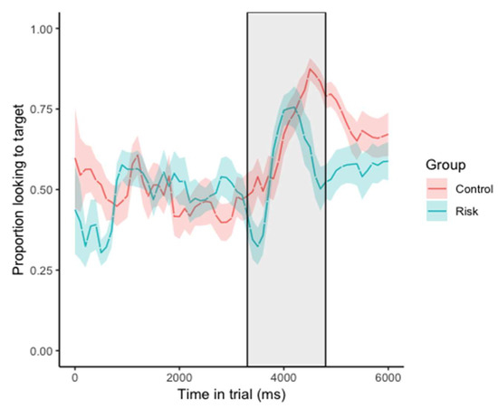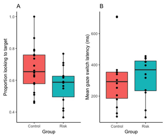 Raw gaze data were extracted from Tobii Studio software and were processed using Eye Tracking R in R [50]. First, segments with data loss were identified, and trials with less than 25% detected gaze were excluded from all subsequent analyses. On average, infants contributed trials with 72% of detected gaze per trial, and this did not differ between the risk and the control groups, t(29) = −0.321, p = 0.750. Next, two response windows were defined: the pre-naming window and the post-naming window. The pre-naming window was from 0 to 3300 ms which included looks to the target and the distracter prior to the presentation of the target label. The post-naming window is the critical response window for analysis of the accuracy and latency of infants’ looking behaviors. This window was from 3300 to 4800 ms, which included looks to the target and the distracter in response to the target label. A 1500-ms response window was used for analyses as looking behaviors later in the trial are unlikely to represent responses to the target label [29]. Proportion of time looking (PTL) to the target out of the total looking time to the target (T) and the distracter (D) was calculated [PTL = T/(T + D)] for each time window and was used as the dependent variable in all analyses.