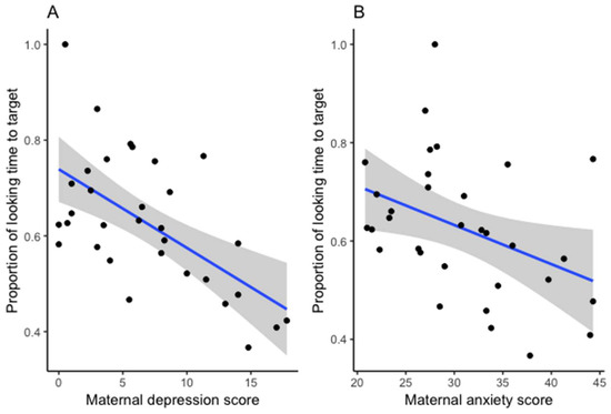 Infants’ lexical processing accuracy scores in relation to maternal depression (A) and anxiety (B) (the lines illustrate the linear model results and shaded areas represent the standard error of the mean).