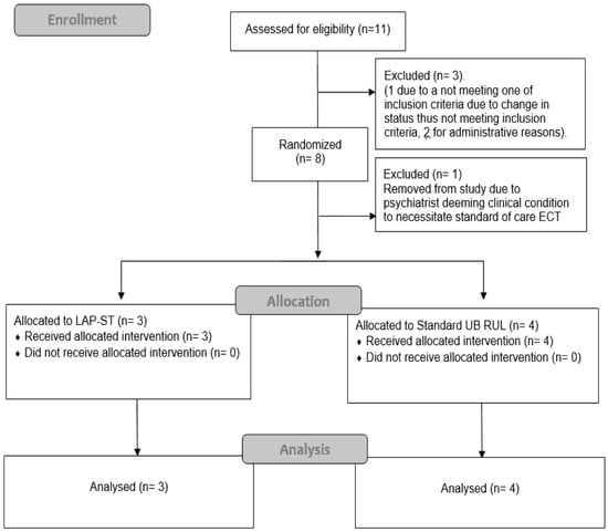 The aims of this pilot randomized study were as follows: (1) Examine whether LAP-ST minimizes CSEs compared to Ultrabrief RUL (UB-RUL) ECT (the standard ECT with the least CSEs) using Time to Orientation (TRO). TRO was the primary outcome, as it is the most sensitive to change []; (2) Compare effect on depressive symptoms between the two treatment groups. This study was intended to be as a pilot study and not a definitive trial.
