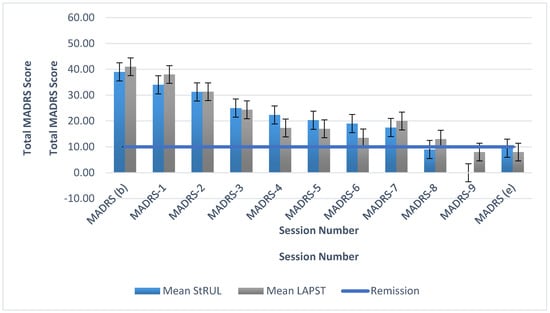 Means (SE) of MADRS scores for LAP-ST and UB-RUL ECT: Baseline MADRS score for LAP-ST = 41.0; SE = 2.0, and for RUL = 39.0; SE = 3.8. Endpoint MADRS score for LAP-ST = 8.0; SE = 7.2, and for RUL = 9.5; SE = 3.8.