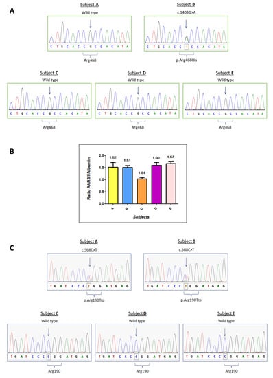 Molecular analysis of patients A to E. (A) Sanger Sequencing of the MFN2 gene regarding the variation c.1403G > A, p.Arg468His. (B) Real-time qPCR results for AARS1 duplication. The expected ratio is approximately 1.5 in case of duplication (three copies versus two copies) or 1 if there are no copy number variations. The plot reports the ratio means and standard deviations for each subject. (C) Sanger sequencing analysis of the MORC2 gene regarding the variation c.568C > T, p.Arg190Trp.