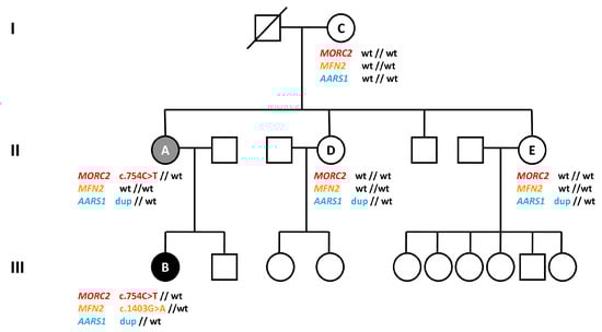 We describe here the genetic analysis of a family with two axonal CMT (CMT2) cases: Patient A (mother), characterized by axonal impairment, and patient B (daughter), with a more severe clinical condition. NGS analyses associated with Cov’Cop analysis, allowing the detection of structural variants (SV) [], showed that both of them presented a known pathological mutation in MORC2 (microrchidia family CW-type zinc-finger 2) and a never-described AARS1 (alanyl-tRNA-synthetase) duplication. In addition, the more affected daughter had a third variation in MFN2 (Mitofusin 2).