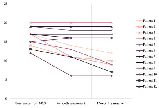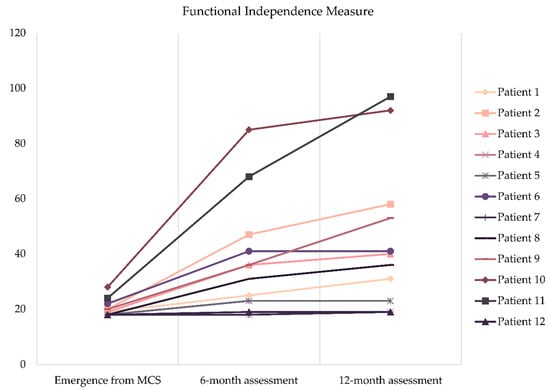 The assessment with the Functional Independence Measure showed that patients improved from a mean total score of 20.2 ± 3.1 at the moment of emergence from MCS to a mean score of 37.2 ± 20.9 six months later (t(11) = −3.295, p = 0.007), and continued to increase until 44.0 ± 26.9 at the 12-month assessment (t(11) = −2.688, p = 0.021). The individual progress of each patient is shown in Figure 4.