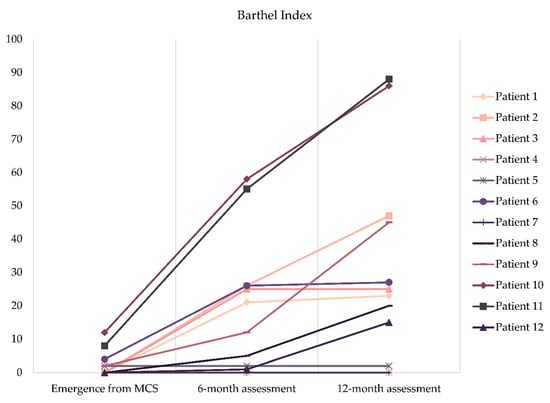 The Barthel Index identified all patients as being totally dependent at the emergence and showed a mean score of 2.3 ± 3.9. Six months after emerging from the MCS, the level of dependence of half of the patients improved from total to severe, and the mean score in this scale increased to 19.2 ± 20.3. One year after emerging from MCS, five patients were totally dependent, five patients were severely dependent, and the remaining two patients were moderately dependent (and almost reached the threshold of slight dependence). The mean score in the Barthel Index was 31.5 ± 30.1 at the 12-month assessment. Improvements from emergence to the 6-month assessment (t(11) = −3.413, p = 0.006) and from the 6-month to the 12-month assessment (t(11) = −3.125, p = 0.010) were statistically significant. The individual progress of each patient is shown in Figure 3.