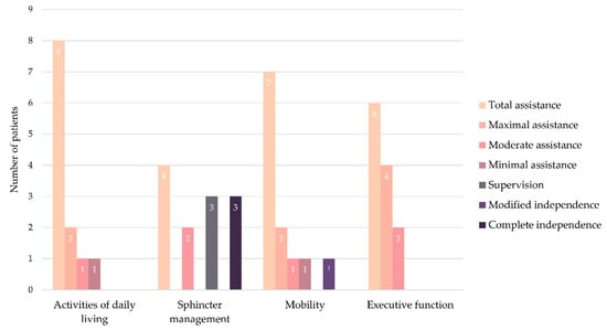 However, it is important to highlight that the time from emergence to the last assessment was one year in our study, and higher than four years in the study by Estraneo and colleagues []. The higher timing of the last assessment in the latter study did not reflect improvements in the functional independence of the patients, even though they had much more time to improve. Although the number of patients is not sufficient to establish reliable associations, this could evidence a flattening of the clinical progression. This effect has been recently described in certain recovery patterns, estimated through multi-trajectory modeling of collected data from unresponsive patients of the Traumatic Brain Injury Model System Programs of the National Institute on Disability and Rehabilitation Research []. Although this work included all patients who were unable to follow commands and, consequently, distinction between DOCs and other pathological conditions was not possible (and even less between UWS and MCS), it could provide an approximate description of the course of functional recovery after traumatic brain injury. This study also showed a greater difficulty at regaining independence with cognitive tasks. While almost three-quarters of the followed-up patients were independent with self-care and mobility, only one quarter was independent with cognitive tasks 10 years after post-injury []. In the study by Estraneo et al. almost all the six patients who emerged from MCS had impaired abstract reasoning, selective attention, and verbal learning more than four years post-injury []. In line with this, all patients in our study needed some kind of assistance to perform the activities of daily living and those that involved executive functioning, according to the functional independence staging. In contrast, half of the patients were independent or only needed to be supervised during tasks that required sphincter management. Mobility was also challenging for all our patients, with only two patients, the aforementioned patients 10 and 11, who were minimally dependent and independent with a device, respectively.