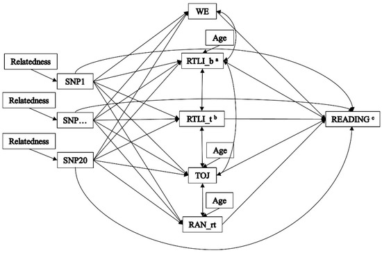 The multiple-predictor/multiple-mediator model. WE = multisensorial warning effect; RTLI_b = rotating-tilted-lines illusion, slope; RTLI_t = rotating-tilted-lines illusion, threshold; RAP = rapid auditory processing; RAN_rt = rapid automatized naming of colors, reaction time. Family relatedness was controlled as clustering variable upon the SNPs’ effects. We also controlled for the correlations between RTLI_b, RAP and RAN_rt, and “age”, between between WE and RTLI_b, between RAP and RTLI_b, RTLI_t and RAN_rt, and between RTLI_b and RTLI_t (Table S2). a It refers to values after logarithm transformation. b It refers to values after square root transformation. c It refers to the average among text-, single word and single non-words reading tasks (both accuracy and speed).