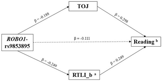 Significant specific indirect effects within the significant total indirect effect from ROBO1-rs9853895 to Reading (standardized estimates of path coefficients are depicted). RAP = Rapid auditory processing; RTLI_b = Rotating-Tilted-Lines Illusion, slope. Family relatedness was controlled as clustering variable upon the SNPs’ effects (cf. “2.5 Statistical Analysis” paragraph). The effect of age was controlled as covariate upon RAP and RTLI_b (cf. “2.5 Statistical Analysis” paragraph). Non-significant paths are indicated by a dotted line. a It refers to values after logarithm transformation. b It refers to the average among text-, single word and single non-words reading tasks (both accuracy and speed).