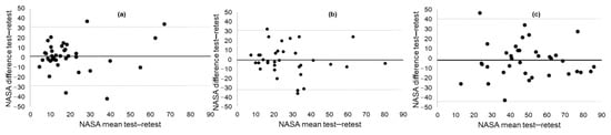Bland–Altman plots of (a) 0-back NASA-TLX; (b) 1-back NASA-TLX; and (c) 2-back NASA-TLX.