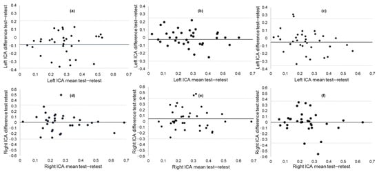 Figure 2 shows the Bland–Altman plots for each test. Plot (a) displays a negative mean ICA difference of the left eye of −0.08, indicating a slight decrease in mean ICA at the two-week follow-up compared to the baseline assessment. Plots (b) to (f) demonstrate equal distribution of the data around zero, indicating no bias in the results and no heteroscedasticity within the data.