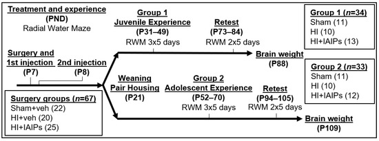 Timeline for surgery, exposure to Hypoxic-Ischemic (HI), Inter-alpha Inhibitor Proteins (IAIP) treatment, Radial Water Maze (RWM) experience, and tissue collection by post-natal day (P#). Subject numbers post-surgery separated into experience groups (Group 1 = Juvenile, Group 2 = Adolescent) are indicated in boxes. All subjects were male rats.