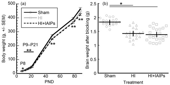 Statistics were performed using SPSS Statistics software (v24, IBM, Armonk, NY, USA). The experimental n is supported by previous studies and a power analysis obtained from previous data, showing that the expected behavioral effect size required a minimum n of 9 per treatment condition to achieve significance at the 0.05 (two-tail) level with a minimum power of 0.8 [37,39]. The numbers for each treatment and experience group were selected as optimal minimums. All errors were totaled for the behavioral analysis, separated by trial and week (4 Trials; 5 Weeks; within-subject factors), averaged by HI treatment and experience group (Sham, HI, HI + IAIPs Treatment; Juvenile and Adolescent Experience; between subject factors), and repeated-measures analysis of variance (RMANOVA) were performed (SPSS). Brain and body weights were compared using the same between subject factors; repeated measures for body weights were based on age at weight determination. Overall statistical comparisons are displayed in text as F [degrees freedom factor, degrees freedom error] and p values. Specific behavioral patterns for all treatment groups over the course of this experiment were expected based on previous studies using the same learning paradigm. Error rates were specifically expected to increase as trials progressed with fewer platform targets leading to a higher cognitive demand. We also expected to observe lower WMI error rates across weeks of testing as a function of learning. Only the second, third, and fourth trials were included in the post-hoc analyses based upon the expected trial demand progression when overall RMANOVA statistics showed a trial x treatment interaction. Pairwise comparisons of simple mean differences were performed for statistical groupings of two or three factors with Sidak corrections for multiple repeated measure comparisons of groupings when statistical main effects were observed using RMANOVA. Post-hoc pairwise comparisons are presented as a t-test (comparison, t [absolute mean difference], p value). Differences are shown on graphs as mean ± SEM, * indicates p < 0.05 for significant pairwise differences or homologous groupings per Tukey post-hoc analyses. All SPSS code and data used are provided in Supplementary Table S1.