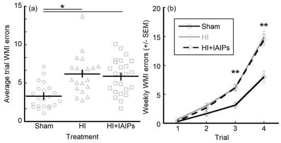 Treatment effects on WMI errors (±SEM), a moderate cognitive demand task component. Total n = 67, Sham (22), HI (20), HI + IAIPs (25). Horizontal bars indicate mean and vertical error bars represent SEM. ANOVA and post-hoc tests indicate both HI and HI + IAIPs treatment groups performed worse than Shams in overall WMI errors across all trials and weeks (a) * indicate significant differences by Tukey’s homologous subsets and (b) ** indicates both HI and HI + IAIPs performed significantly worse than Sham in later trials of the maze protocol over all weeks by paired comparison with Sidak correction.