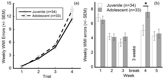 Effects of juvenile versus adolescent experience on performance. (a) Interaction of experience group and trial WMI error performance (±SEM). ANOVA indicates a significant difference between experience groups at specific trials. (b) Interaction of experience group and week WMI performance (±SEM). * Indicates a significant paired comparison in performance overall between the experience groups at this week, with Sidak correction for multiple comparisons.