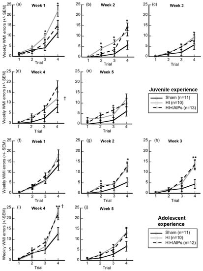 Expanded representation of WMI error performance (±SEM) on individual trials collapsed across weeks. Top two rows (a–e): juvenile first RWM experience starting at P31. Total n = 34, Sham (11), HI (10), HI + IAIPs (13). Bottom two rows (f–j): adolescent first RWM experience starting at P52. Total n = 33, Sham (11), HI (10), HI + IAIPs (12). Each plot is aligned by that experience group’s number of weeks of experience. A three-week break occurs between Week 3 and Week 4 for both experience groups. Paired comparisons were made between both treatments within each graph and between experience groups at the same relative trial, for example, Figure 5a,f. * indicates a trial where one injured treatment group, either HI or HI + IAIPs, performed significantly worse than Sham. ** indicates a trial where both HI and HI+IAIP treatment groups performed worse than Sham. † indicates a trial where the HI-treated, juvenile experience cohort (d) significantly differs from the HI-treated, adolescent experience cohort (i). All corrected by Sidak correction for multiple comparisons.