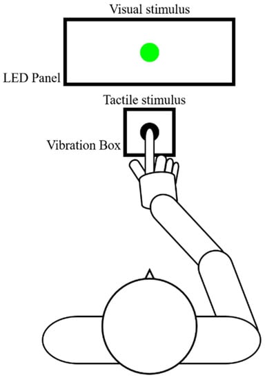 Perceptual biases were measured using the TOJ task [,,,,] (Figure 1). Two stimuli (visual-flash and tactile-vibration) were presented in various stimulus onset asynchronies (SOAs). The child then had to determine which stimulus (visual or tactile) was presented first. The child performed this visuo-tactile TOJ task with a TOJ task device (Keio method, UT-0021, Medical Try System, Tokyo, Japan). The visual stimulus was presented as a green LED on the LED panel (UT-0021-2, Medical Try System, Tokyo, Japan). The luminance of the visual stimulus was 40 cd/m2, and the duration of the visual stimulus was 1 ms. A 1-ms tactile stimulus (converted to vibration by pneumatic pressure) controlled by a 1-V signal from the vibration box (UT-0021-1, Medical Try System, Tokyo, Japan) was presented to the preferred index finger.
