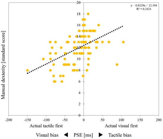 Correlation between perceptual bias and manual dexterity. Scatter plot showing the relationship between the temporal order judgment task and manual dexterity test. The vertical axis shows the results of the manual dexterity test (standard score) of each child. An increase in the standard score indicates an improvement in manual dexterity. The horizontal axis shows the results of the temporal order judgment task (PSE) for each child. Negative PSE values on the horizontal axis represent “visual first” indicators that were higher although the tactile stimulus was actually faster than the visual stimulus. Thus, an increase in the negative PSE value represents an increase in visual bias. Conversely, positive PSE values on the horizontal axis represent the “visual first” indicators when the visual stimulus was actually earlier than the tactile stimulus. Thus, an increase in the positive PSE value represents an increase in tactile bias. Therefore, the closer the PSE value is to 0 (middle line), the lower the perception bias. PSE, point of subjective equality.