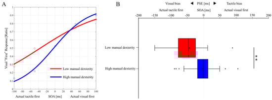 Figure 3A shows the “visual first” response probability curves for both groups, and Figure 3B shows the perceptual biases (PSE) comparison results for both groups. The PSE of the low manual dexterity group (mean ± standard deviation, −43.4 ± 44.0) was significantly lower than the PSE in the high manual dexterity group (mean ± standard deviation, −4.3 ± 33.8) (z = −4.543, p < 0.001, effect size (r) = −0.45; Figure 3B). This indicated that the low manual dexterity group had a significantly stronger visual bias than the high manual dexterity group.