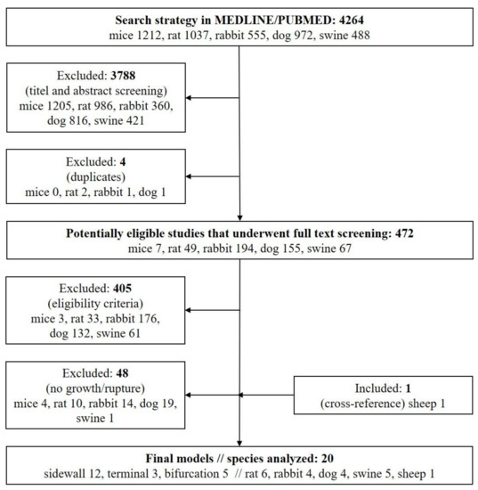 A total of 20 articles were found that described growth and/or rupture of an experimentally created extracranial saccular aneurysm. The initial electronic search yielded 4264 potential studies. Of these, 3788 articles were excluded after title and abstract screening and 4 articles were excluded after identification of duplicates. The remaining 472 articles underwent full text analysis. Of those, 405 studies were excluded according to the predefined eligibility criteria. Another 48 studies describing various saccular aneurysm models were excluded because none of the reported techniques resulted in growth or rupture of the created aneurysms. One study was added by cross-referencing (Figure 1).
