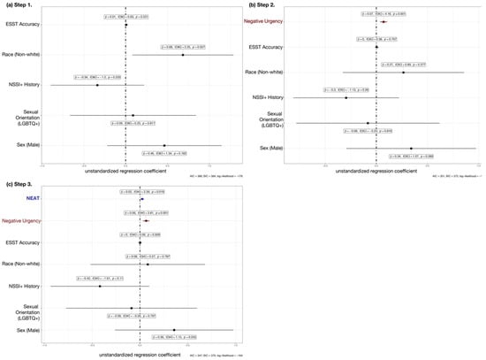 Multiple linear regression results for EDE-Q global scale scores with predictors entered hierarchically in three steps: (a) Sex, gender/sexual orientation, race, NSSI history, ESST accuracy (Step 1); (b) negative urgency (Step 2); and (c) NEAT (Step 3). Both negative urgency and NEAT uniquely contributed significant variance to the prediction of ED symptoms, after controlling for demographic variables, NSSI history, and ESST performance (see Table 3 for additional information). AIC = Akaike’s Information Criterion; BIC = Bayesian Information Criterion.