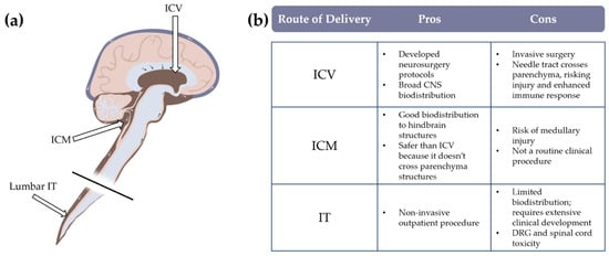 Comparison of central nervous system (CNS)-directed dosing strategies. (a) Schematic diagram of relative location of cerebrospinal fluid (CSF)-targeting injections. (b) Table of pros and cons between common routes of CSF delivery.