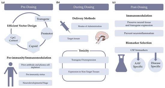 Schematic overview of possible strategies to mitigate immune responses at various stages during gene therapy. (a) Pre-dosing considerations include vector design and treatment strategies to prepare the immune system for adeno-associated virus (AAV) exposure. (b) During dosing of the vector, the route of administration is selected in consideration of disease-relevant target tissues as to minimize toxicities from transgene overexpression or transgene expression in non-target tissues. (c) Post-dosing considerations include selection of immune management strategies that protect trangene expression and neural tissue and decrease neuroinflammation. .