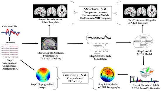 In what follows, the descriptions of the components of the analysis pipeline for the third part of the study are organized according to the sequence of steps illustrated in Figure 1. From the information derived from the ICA (Step 1) and the estimated dipoles (Step 3), we derived simple single spiking representations adopting electric-fields estimation modeling (Step 5). Next, the results of Step 5 were used to implement an ERP-based Adaptive Control of Thought—Rational (ACT–R) modeling approach previously validated on the same task [,]. We organized the simulated dipoles and the simulated ERP spikes in patterns or chunks of activity corresponding to cortical areas postulated in the adult ACT–R (Step 6). The results of Step 6 allowed us to simulate the sequence of spatiotemporal activity as dipoles mapped onto the same adult structural MRI template as the children’s data (Step 7). This was the basis for comparing children’s and simulated adult estimated localization, therefore, testing for structural homology.