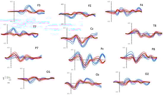 An elastic cap (Quik Cap, Neuroscan, El Paso, TX, USA) adhering to the standard ten–twenty international system of electrode placement, with recessed Ag–AgCl electrodes (10 mm each) was used for the EEG recordings. The cap montage included 12 electrodes corresponding to electrode reference points at Frontal (F3, Fz, F4), Central (Cz), Temporal (T7, T8), Parietal (P7, Pz, P8), and Occipital (O1, Oz, O2) sites. Horizontal and vertical electro-oculograms (EOG) recorded eye movements with two split bipolar electrodes positioned at the outer canthi for the horizontal EOG and on the suborbital ridge of each eye for the vertical EOG. Previous work and pilot studies in children of similar ages [,,,,] suggest no critical loss of reliability in source analysis performed with the present set up.