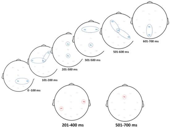 The results of the ERP activity paths analysis are shown in Figure 6. Neural paths of maximum mean difference in neural activity for targets are shown in blue and neural paths of maximum mean difference in neural activity for distractors are shown in red. The paths were constructed from the results of Table 2.