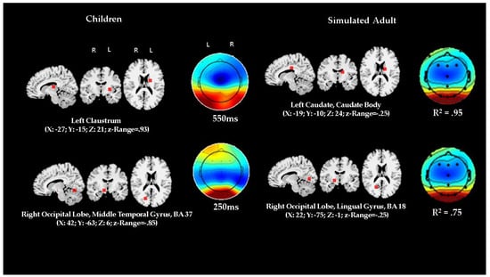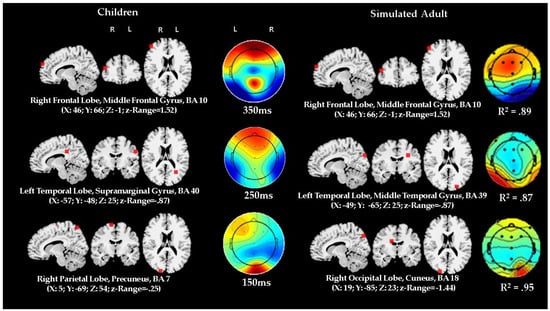 Lastly but not least, although our modeling and simulation procedures are grounded in the literature, being validated by separate tests of the most relevant components of ERPs from actual adult samples [,,], still we did not report data from an actual adult comparison group. While we acknowledge that in this respect our results are preliminary, and indeed this is a desirable priority for future research, adult comparison on this version of the VSSAT might not necessarily augment the strength of the supporting evidence because it presents non-trivial methodological challenges. In particular, we have learned from small pilot studies in our lab that the current VSSAT is not appropriate for adults. This task needs to be adapted to prevent confounds of other spurious aspects (i.e., boredom, engagement level, ceiling effects) occurring in adult participants (but not in preschool children). In other words, this task should be modified significantly to “equate” children’s state and age-appropriate task demands. However, as pointed out by others (notably, see []), if children and adults are not compared on the same task, data interpretation would still depend on assumptions derived from a priori hypothetical models. Consequently, under such differing conditions, the correspondence defining homology on the basis of comparisons between actual adult and children ERP data would still be based on a type of model-mediated inductive inference. This would be essentially similar to the present approach, therefore, the resulting evidence would not be more “direct” or “realistic” or logically different than the one offered here.