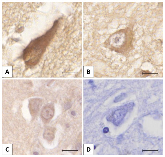 The figure presents different lemur tyrosine kinase 2 (LMTK2) immunolabelling intensities in neurons: (A) strong positivity (3+); (B) moderate positivity (2+); (C) mild positivity (1+); (D) negative (0). The protein was visualized by 3,3′-diaminobenzidine (DAB) chromogen. Nuclear counterstain with hematoxylin. Scale bar: 10 µm.