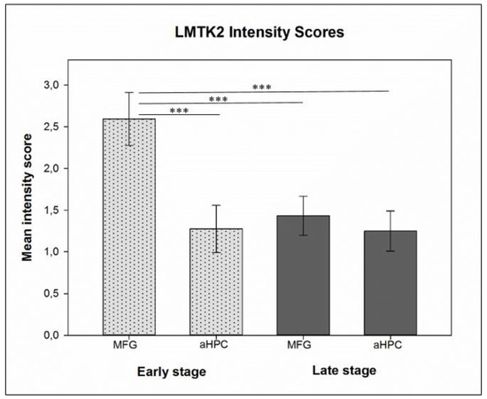 Histogram depicts the mean chromogenic lemur tyrosine kinase 2 (LMTK2) intensity scores in the middle frontal gyrus (MFG) and anterior hippocampus (aHPC) brain regions in early (dotted light gray columns) and late (dark gray columns) neuropathological Braak tau stage cases. Here, t-test showed statistically significant (p < 0.001 (***)) differences between pairwise comparison of the mean intensity scores of early neuropathological stage MFG group (endogenous control—spared from neurofibrillary tangles (NFTs)) vs. NFT-affected groups (aHPC in early neuropathological stage and both regions in late neuropathological stage).