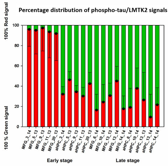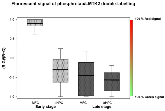 Phospho-tau/LMTK2 FDL-IHC showed LMTK2 predominance in the endogenous control group (MFG in early neuropathological stage), while phospho-tau overburden and decreased LMTK2 immunolabelling were detected in NFT-affected groups (aHPC in early and both regions in late neuropathological stage) (Figure 3). The measured percentage distribution of phospho-tau/LMTK2 values of the individual cases are visualized in Figure 4. Group level comparison of LMTK2 (red) and phospho-tau (green) fluorescent signals, derived from the case-based evaluation, are shown in Figure 5.