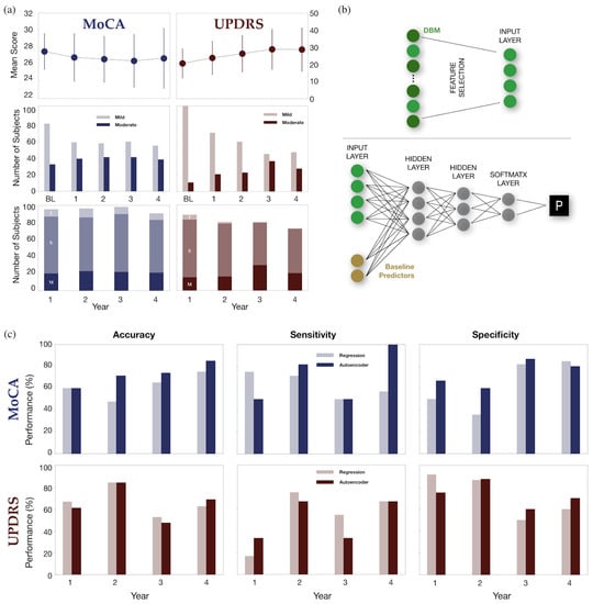 (a) Average Montreal Cognitive Assessment (MoCA) scores over time (top left), number of subjects in each category at baseline (BL) and following years (mid left), and observed change in cognition over the years (bottom left). I, S, M mean Improved, Stable, and Moderate Impairment, respectively. Analogous plots for MDS-UPDRS-III scores on the right. (b) Architecture of the implemented two-step deep autoencoder neural network (NN). Deformation-based Morphometry (DBM) features were selected using a Spearman’s correlation statistical test (top) and then used as input, along baseline predictors, for the NN (bottom). The two hidden layers were comprised of stacked sparse autoencoders using the logistic sigmoid activation function. A final SoftMax layer was used for classification. (c) Performance of MoCA (top, blue) and UPDRS (bottom, red) predictions for test sets in both regression (light tone) and Autoencoder (dark tone) models. Accuracy, sensitivity, and specificity are shown from left to right.