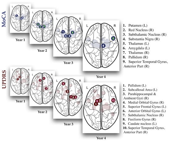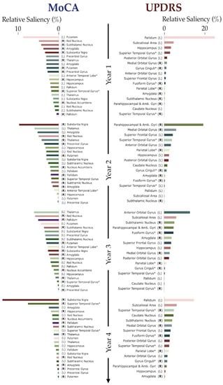 Figure 3 provides a quantitative assessment of the saliency regions for each year, showing all (i.e., non-thresholded) areas from the NN’s input layer. For each model prediction (MoCA and UPDRS), regions are uniquely colored and then ranked by their relative contribution to that year’s prediction. The reordering of colors, observed from year to year, illustrates the malleable nature of this ranking, emphasizing how the roles played by regions significantly differ depending on the stage of PD progression being predicted.