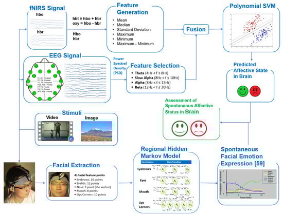 The measurement of neural correlates of cognitive and affective processes using concurrent EEG and fNIRS, multimodal functional neuroimaging, has seen growing interest [,,,]. As fNIRS and EEG measure complementary aspects of brain activity (hemodynamic and electrophysiological, respectively), a hybrid brain data incorporates more information and enabling higher mental decoding accuracy [] confirming earlier findings []. Specifically, in [] we showed that body physiological measures (heart rate and breathing) did not contribute any new information to fNIRS + EEG based classification of cognitive workload. Another recent study reported in [] utilized fNIRS and EEG as well as with autonomic nervous system measures, including skin conductance responses and heart rate, for emotion analysis. Authors reported strong effects observed in fNIRS and EEG when comparing positive and negative valence. And, they confirmed prefrontal lateralization for valence. Finally, heart rate didn’t show any effect, but skin conductance response demonstrated a difference although no comparison was done if this adds to EEG or fNIRS. In a more recent study, authors used prefrontal cortex based fNIRS signals recording during emotional video clips to recognize different positive emotions []. In this study, we investigated spontaneous facial affective expressions and brain activity simultaneously recorded using both fNIRS and EEG modalities for affective state estimation. The block diagram of the system is displayed in Figure 1.