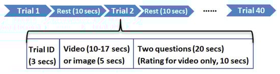 Each participant was assigned to complete two tasks according to the experimental protocol shown in Figure 2. In the first task, each participant was asked to watch twenty videos with various emotional content. Each video lasted 10–17 s such that the participant can recognize the type of affect. After watching a video, the participant answered two simple questions (e.g., Were you able to watch the video carefully? What were you seeing?) in order to verify he understood the video content. In addition, each participant was asked to evaluate the type of affect (positive or negative) and the degree of the affect using a ten-point Likert scale (ranging from 1 = extremely negative to 10 = extremely positive) in response to a set of affective states. It is worth noting that the participant did not know the video contents in advance. The advantage of this experimental procedure is that each participant naturally gives the final ratings in the absence of prior knowledge. In the second task, each participant was asked to observe twenty emotional images from Nencki Affective Picture System (NAPS) []. Each image was displayed for five seconds. Analogously, the participant answered two simple questions about the image content after observing the image.